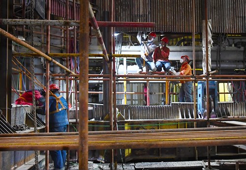 国电电力北仑发电公司实施国内首台600兆瓦机组锅炉整体接长技术。图为锅炉改造现场