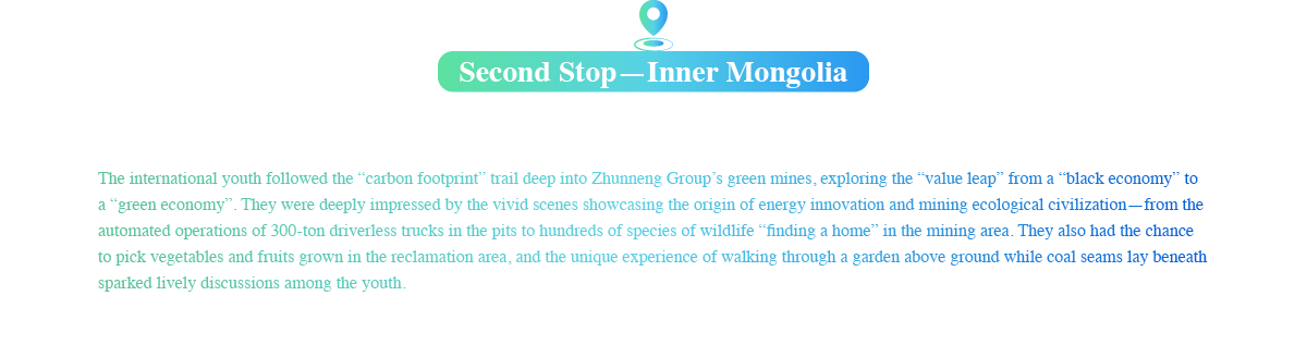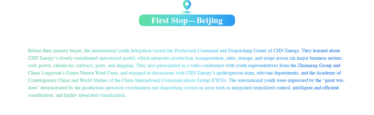 From August 9 to 13, the second “World Youth Energy Tour” kicked off in Beijing. Fifteen international youth representatives from ten countries visited CHN Energy’s headquarter, Zhunneng Group, and Longyuan Power Yumen wind farm. Embracing “innovation” and “sustainability”, they gained an understanding of China’s region-specific approach to developing new productive forces and advancing high-quality growth in the energy sector, reflecting Chinese path to modernization.